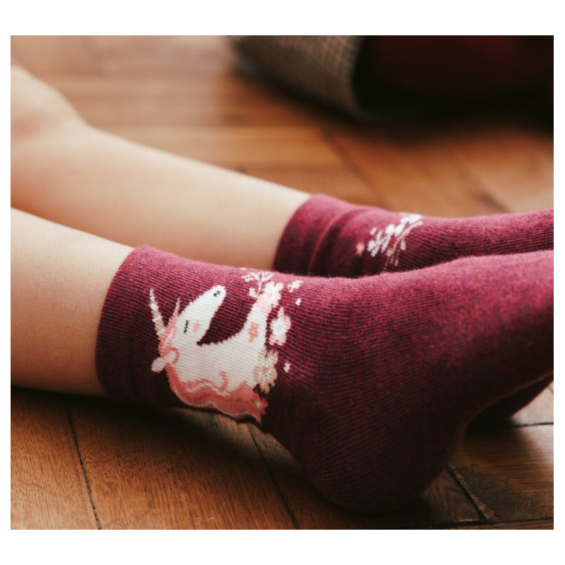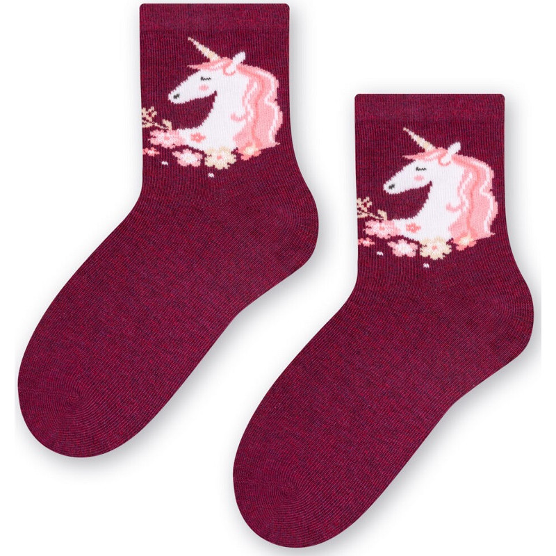 Veselé bavlněné ponožky pro dívky, jsou trochu užšího střihu a nedoporučujeme je pro baculaté nožky. Nad kotníkem je obrázek jednorožce a kvítků.