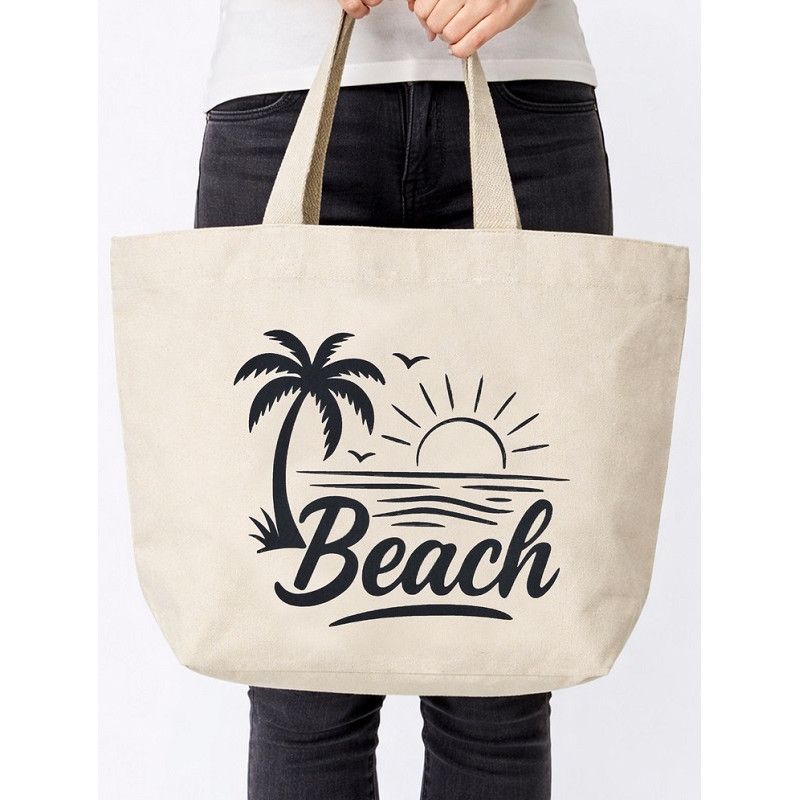 Extra veľká nákupná alebo plážová taška z hrubšej nepriehľadnej tkanej látky, na jednej strane má potlačený obrázok pláže a nápis Beach (pláž).  Má dlhé uši  a je možné ju nosiť aj na ramene.