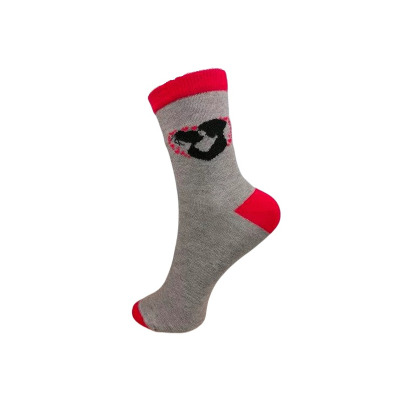 Valentínsky ladené farebné obrázkové ponožky určené pre dámy a dievčatá, majú pohodlný lem, retiazkovú špicu. Vzor - zaľúbená dvojica v oblasti členka.